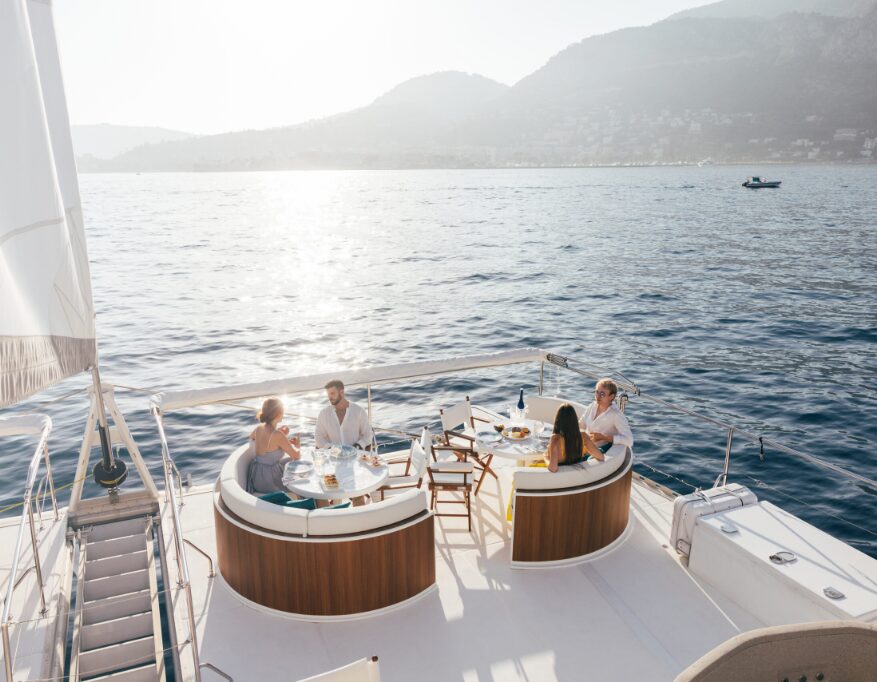 Our catamaran sails smoothly, with luxurious sunbeds and elegantly set tables.